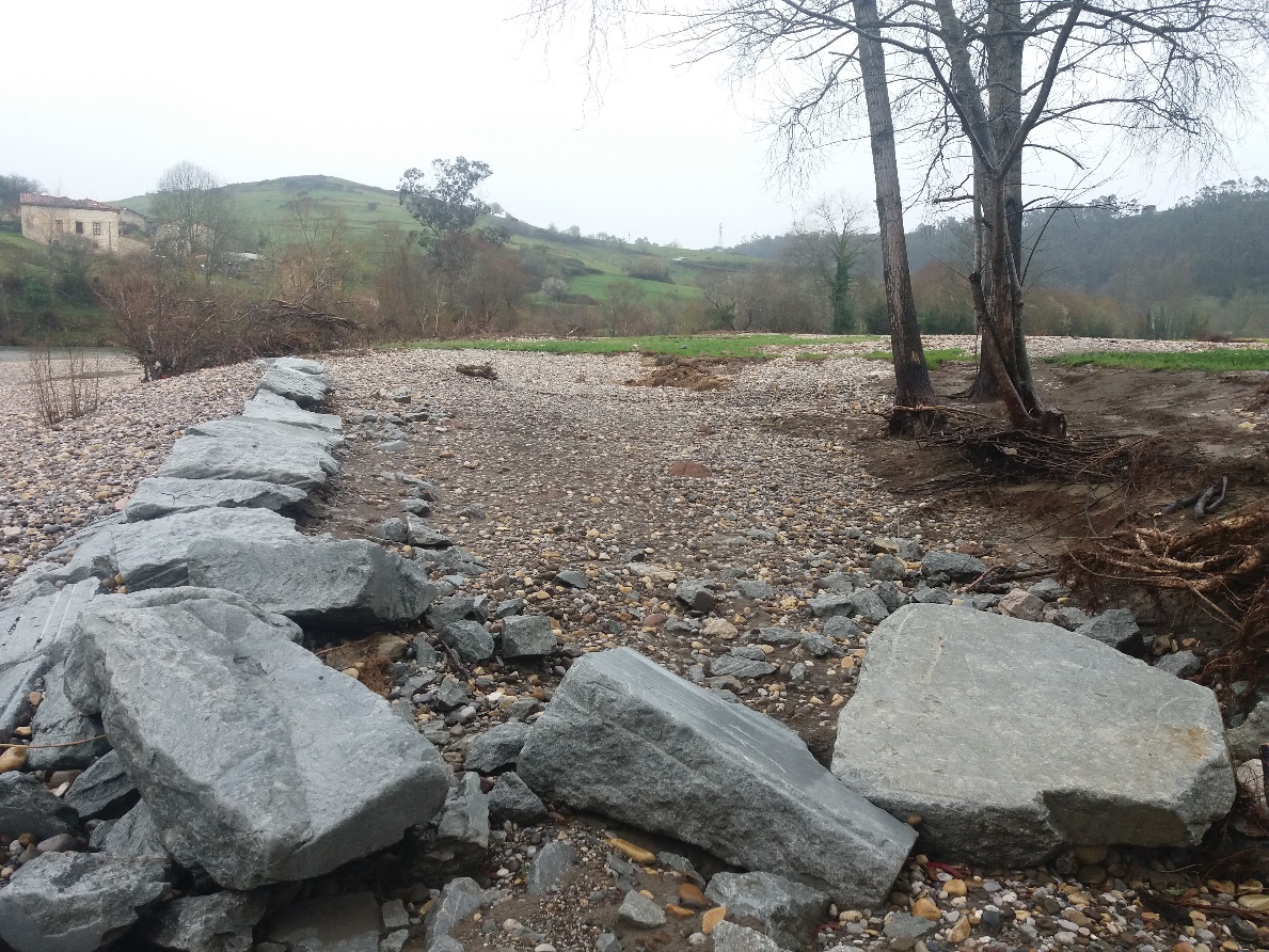 La protección de margen existente en las inmediaciones de la Vega de Molleda, término municipal de Val de San Vicente, la escollera de protección situada en la ribera de la margen derecha del río Deva se vio afectada en su coronación por avenidas ocurridas a finales del año pasado, que produjeron, además, una importante acumulación de sedimentos arrastrados.