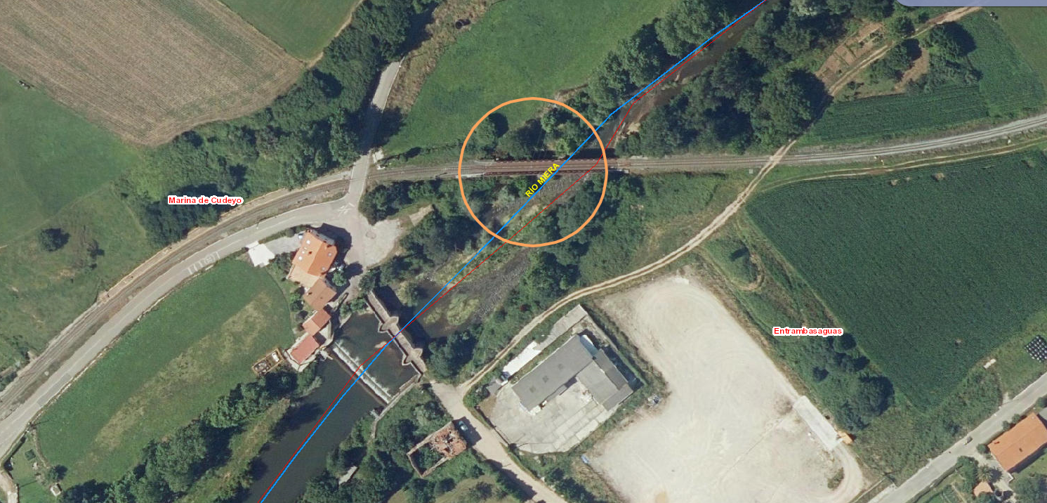 A la altura del puente del ferrocarril, en torno al vano izquierdo, se ha depositado una importante acumulación de áridos. Este depósito reduce la sección del cauce y favorece la acumulación de material vegetal, formando tapones en torno al pilar del puente, por lo que es necesario retirar este material.