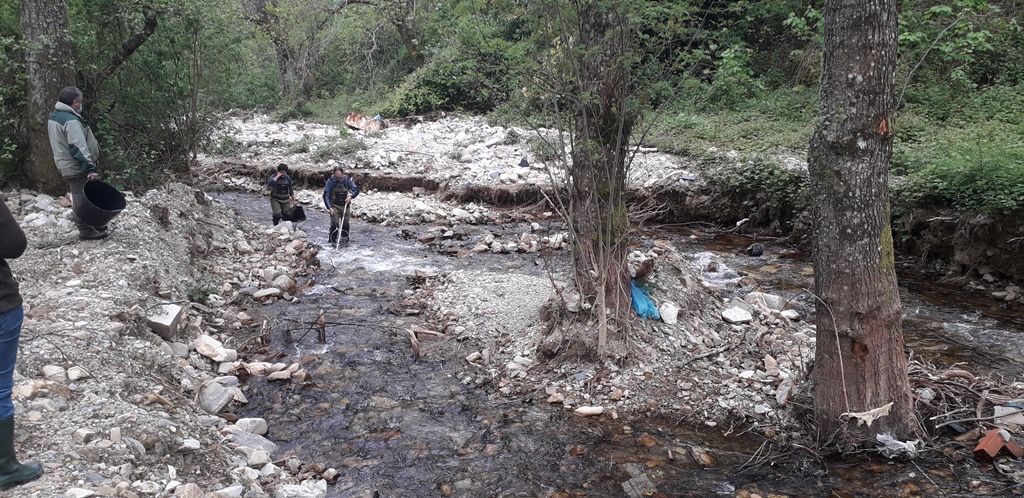 La actuación se inició desarrollando una pesca eléctrica para trasladar a la fauna piscícola fuera del ámbito de la actuación y recuperando la sección de desagüe natural del río mediante la retirada del exceso de acarreos acumulados para su recolocación en las márgenes.