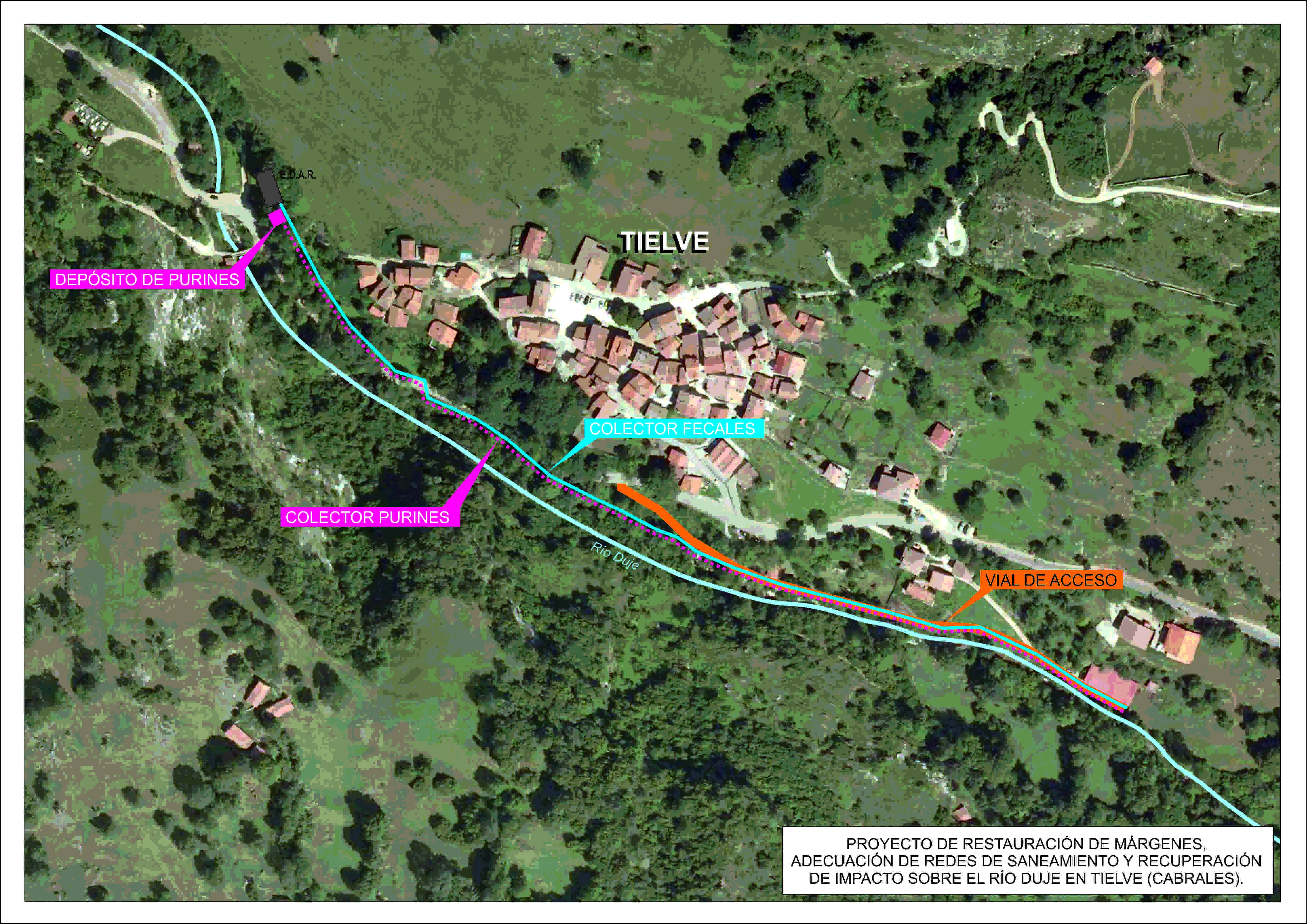 Las actuaciones proyectadas contemplan la construcción de un nuevo vial, de unos 300 metros de longitud, paralelo al cauce del río Duje por su margen derecha y la mejora de la margen derecha del río Duje en la zona de las cuadras, origen de los vertidos, así como la construcción de nuevas redes de saneamiento y un depósito de acumulación de purines.