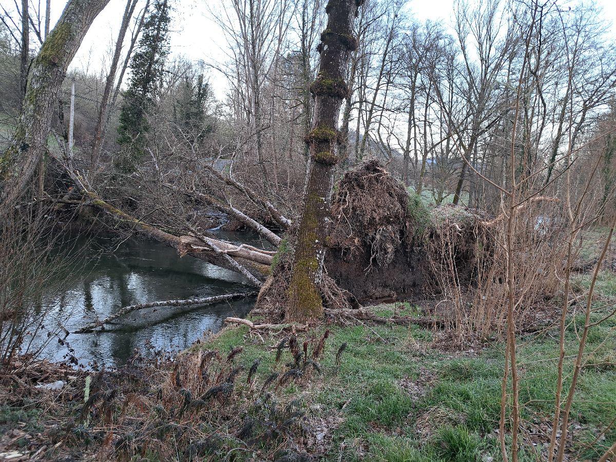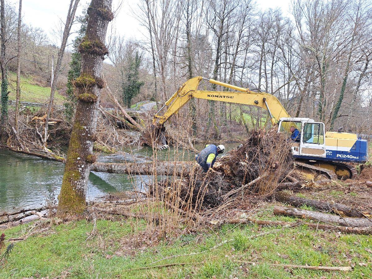 La actuación se ejecuta en un tramo de unos 50 m de cauce en el que se han retirado varios árboles caídos como consecuencia de los últimos temporales. Igualmente se ha procedido a la retirada de aquellos secos, enfermos o con riesgo de caída. Estas labores tienen el objeto de evitar la formación de tapones y mantener la capacidad de desagüe del cauce.