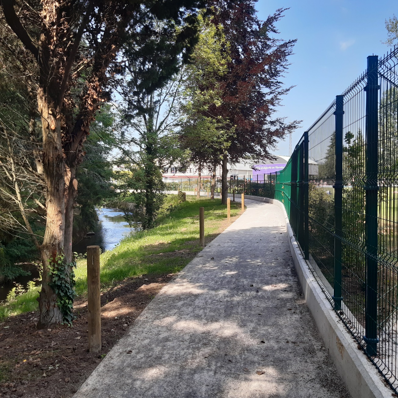 La actuación se ha complementado con la señalización de la senda con rollizos de madera de un metro de altura, que servirán de referencia visual, la recolocación del seto existente junto al nuevo cerramiento, para favorecer la privacidad de los usuarios de la piscina municipal, y el acondicionamiento ambiental de la zona de servidumbre del río en todo el tramo de la actuación.