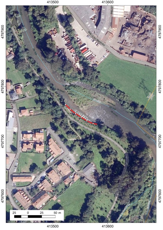 En este tramo se ha detectado la formación de una isla central de acarreos que obstaculiza el desagüe natural del río. Esta circunstancia desvía el flujo hacia la margen izquierda, donde ya se aprecia la erosión de unos 15 metros de ribera, con afección directa a la escollera que protege el colector Saja–Besaya.