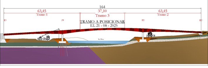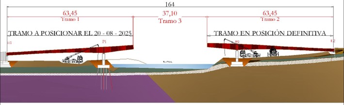 Las dimensiones y peso de las piezas, junto con la gran precisión requerida en su colocación para los trabajos de soldadura, imponen la necesidad de limitar las operaciones a condiciones meteorológicas óptimas, especialmente con respecto a la velocidad del viento y la ausencia de precipitaciones, factores que pueden condicionar el desarrollo del proyecto. Los trabajos para ejecutar la losa de hormigón que cierra la viga cajón mixta se desarrollarán en las semanas siguientes.