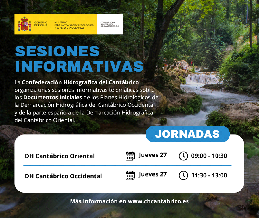 La Confederación Hidrográfica del Cantábrico organiza dos sesiones informativas telemáticas sobre los Documentos iniciales de los Planes Hidrológicos de la Demarcación Hidrográfica del Cantábrico Occidental y de la parte española de la Demarcación Hidrográfica del Cantábrico Oriental el próximo jueves 27 de febrero de 2025.