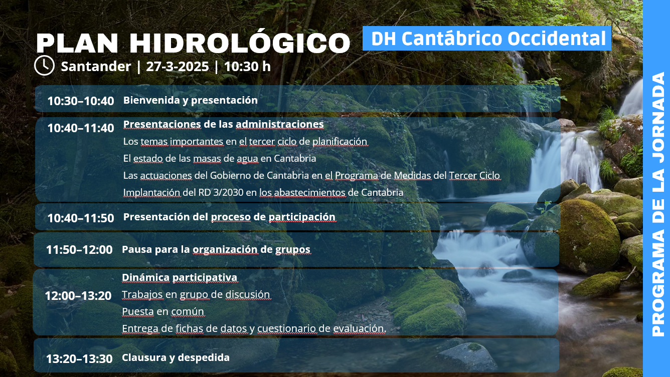 Los interesados en asistir deben enviar sus datos de contacto al correo electrónico participacion.planificacion@chcantabrico.es. Debido a limitaciones de aforo, la asistencia está restringida a 30 personas.