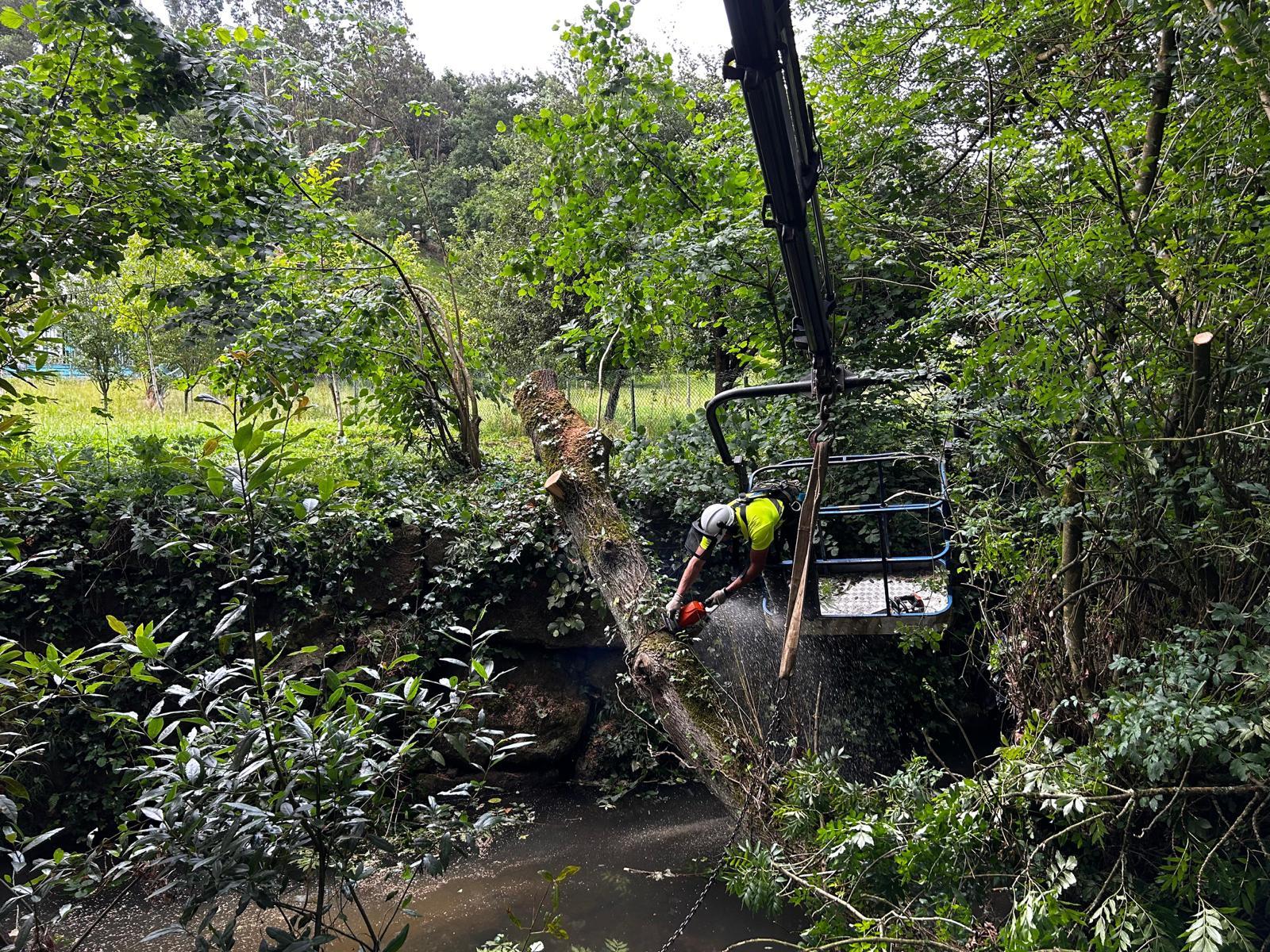 La Confederación Hidrográfica del Cantábrico ha finalizado los trabajos de mantenimiento y conservación en el río Noreña en las inmediaciones de La Figarona, donde se ha retirado un árbol de grandes dimensiones caído trasversalmente sobre el cauce, que además afectaba a una línea telefónica. Para su retirada se ha necesitado el uso de maquinaria con cesta elevadora.