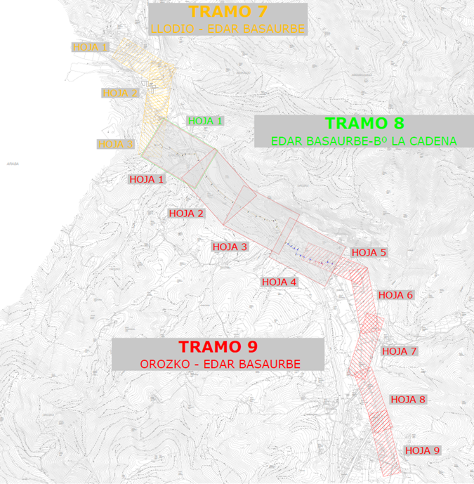 - El de Llodio (Tramo 7): que se centra en el desvío del vertido del colector del barrio de Areta hasta la estación de bombeo de Areta, para incorporarlo al colector municipal y la ejecución de una estación de bombeo / tanque de tormentas en Llodio para el bombeo posterior del saneamiento municipal hasta la EDAR de Basaurbe, situada aguas arriba del palacio de Anuncibai, frente a la salida del peaje de la autopista A-68.