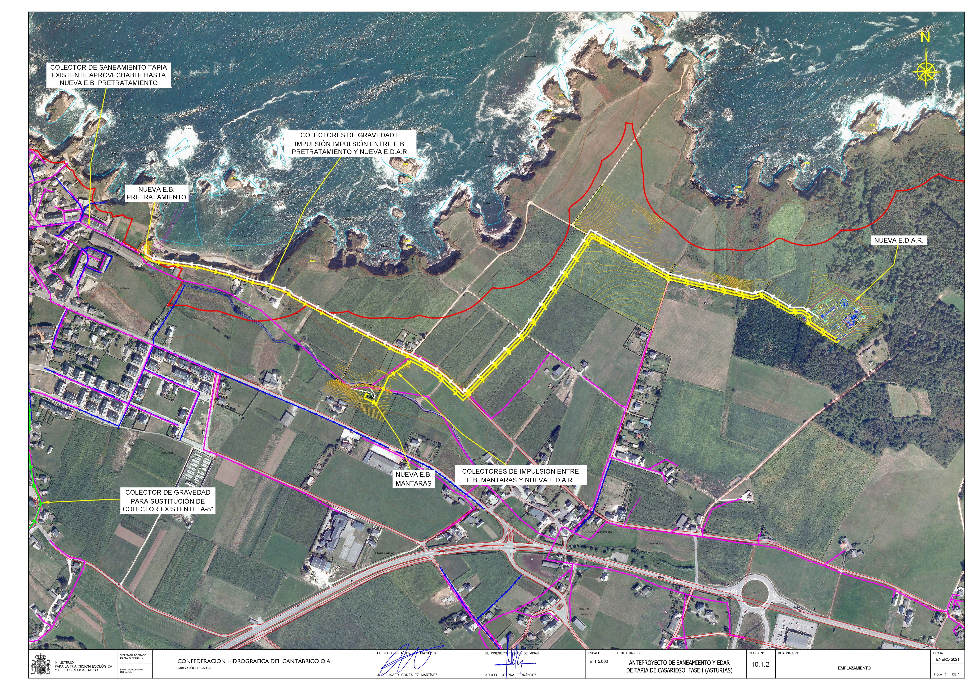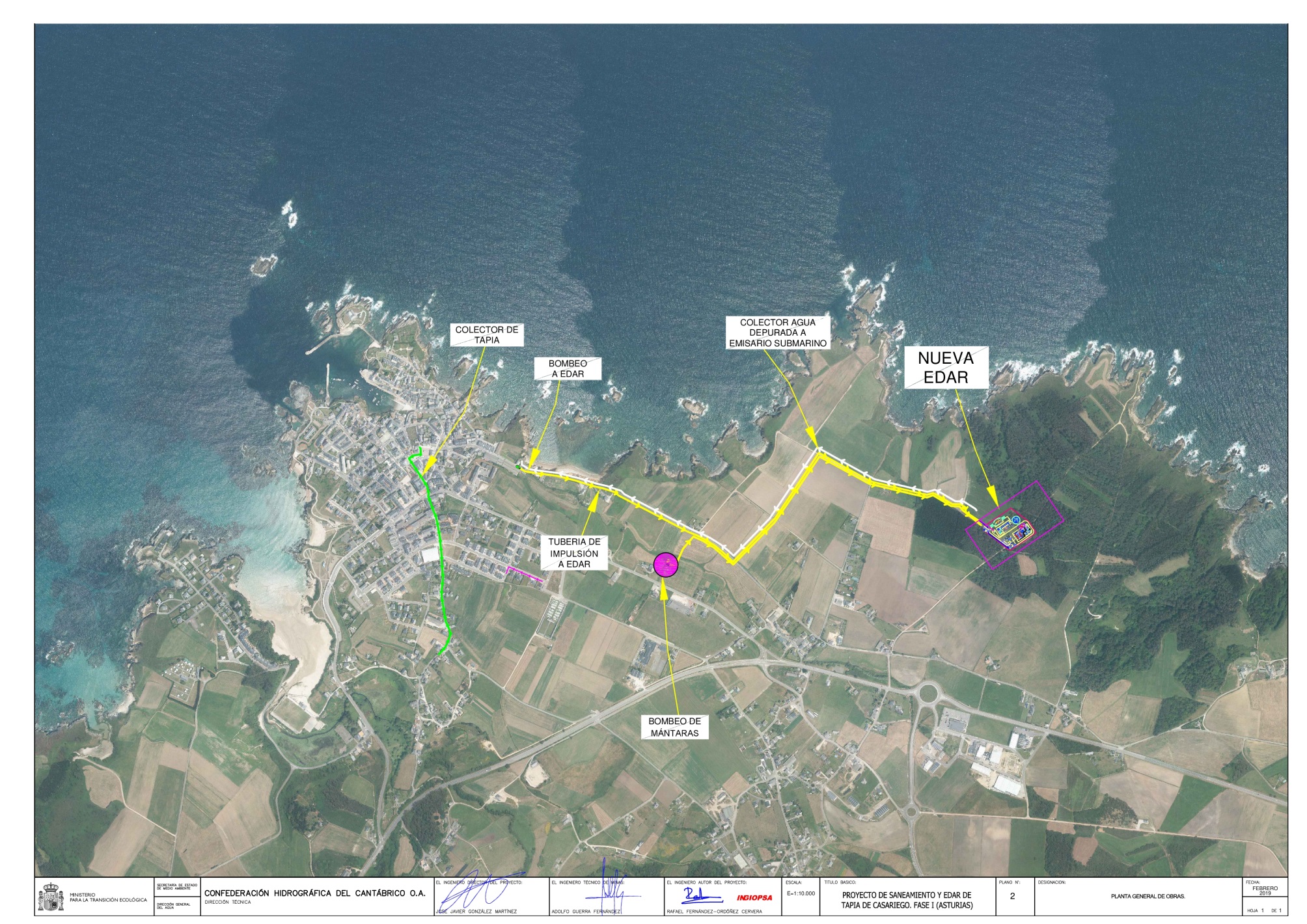 El proyecto contempla la construcción de una red de 7,6 km de colectores de saneamiento que permitirá agrupar los vertidos de aguas residuales del núcleo de Tapia de Casariego y trasladarlos hasta una nueva estación de tratamiento de aguas residuales (EDAR), diseñada para dar servicio a 26.000 habitantes equivalentes con una capacidad de tratamiento de 600 m3/h.