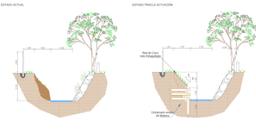 Las actuaciones se ejecutan a lo largo de un tramo de 25 m y cuentan con un presupuesto inicial de 15 000 €. Las labores principales consisten en la estabilización de un tramo de la margen izquierda mediante el empleo de técnicas de bioingeniería, con el objeto de recuperar la sección de desagüe del cauce y evitar daños mayores en las márgenes.