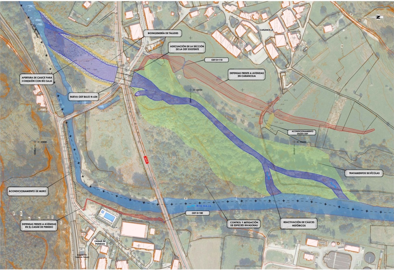 Para ello, el proyecto plantea recuperar antiguos brazos del río Saja, actualmente sin funcionamiento, a los que se les dará continuidad hasta aguas abajo de Casar de Periedo, para lo que será necesario la construcción de una obra de drenaje bajo la carretera N-634 a su paso por Caranceja.