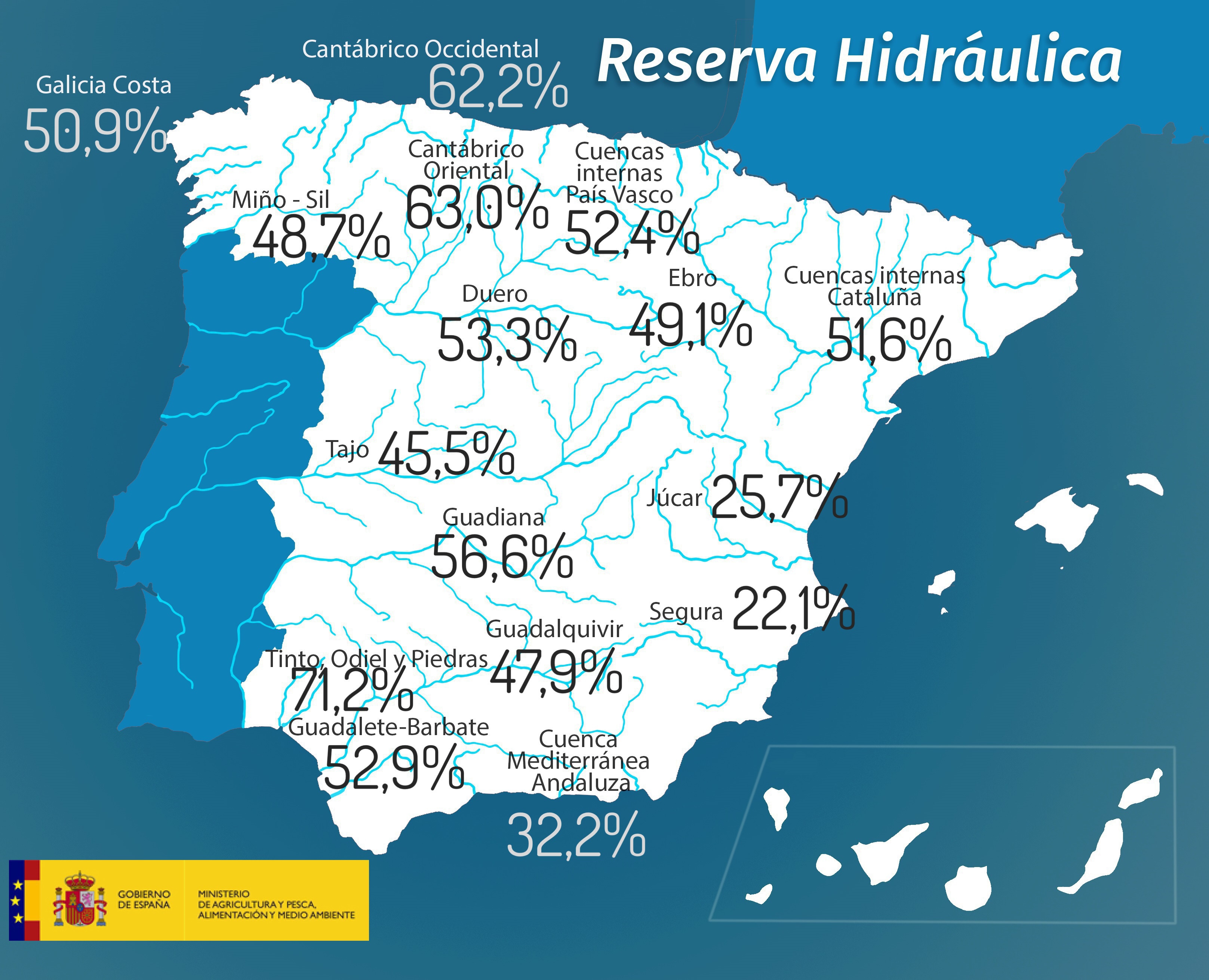 La reserva hidráulica española se encuentra al 48,1% de su capacidad. Actualmente la reserva hidráulica es de 26.928 hectómetros cúbicos