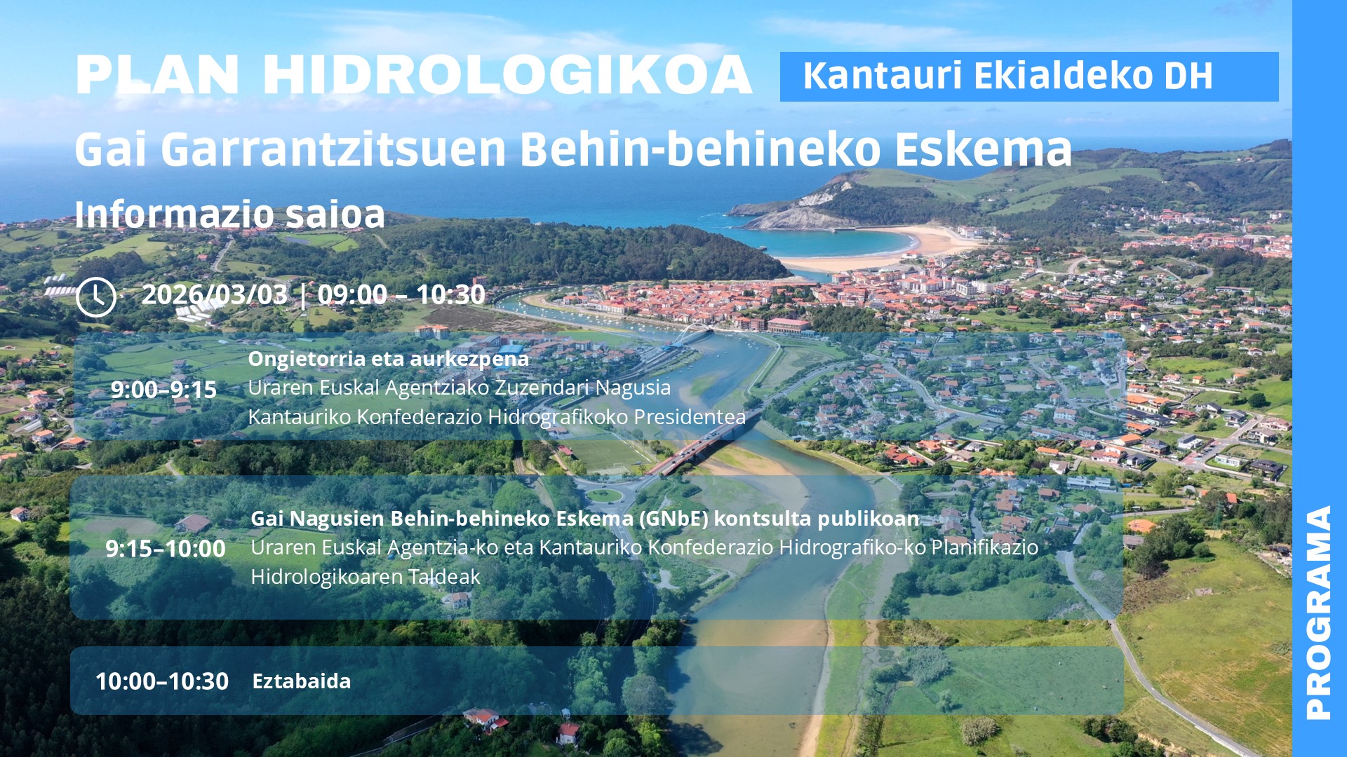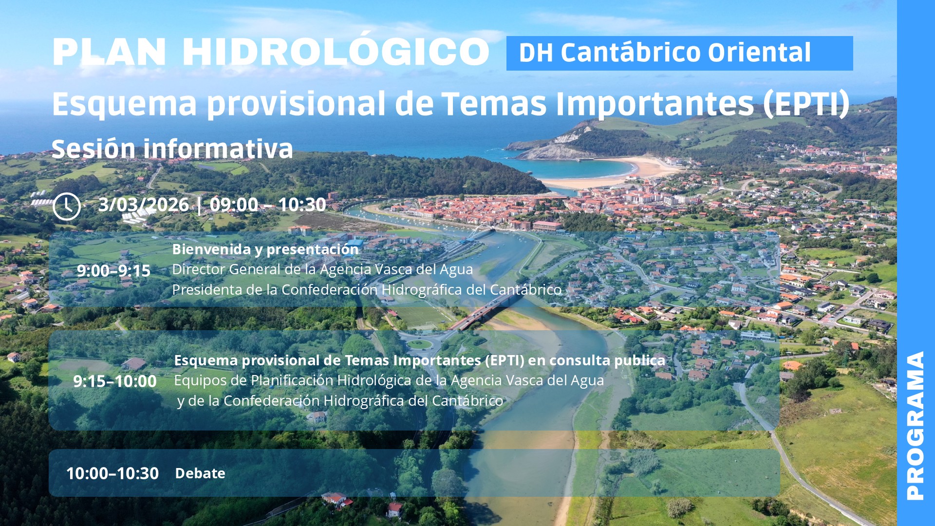 A continuación puedes consultar el programa de la sesión informativa sobre el Esquema Provisional de Temas Importantes del Plan Hidrológico del cuarto ciclo.