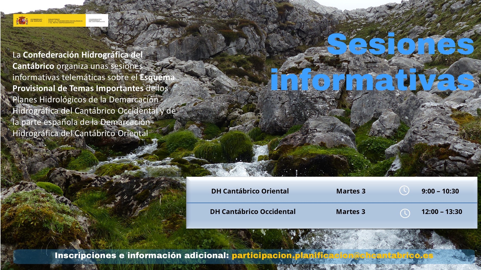 La sesión está abierta a todos los interesados. Si desea asistir a las mismas debe remitir un correo a la dirección participacion.planificacion@chcantabrico.es indicando si desea asistir a una de las sesiones o ambas.