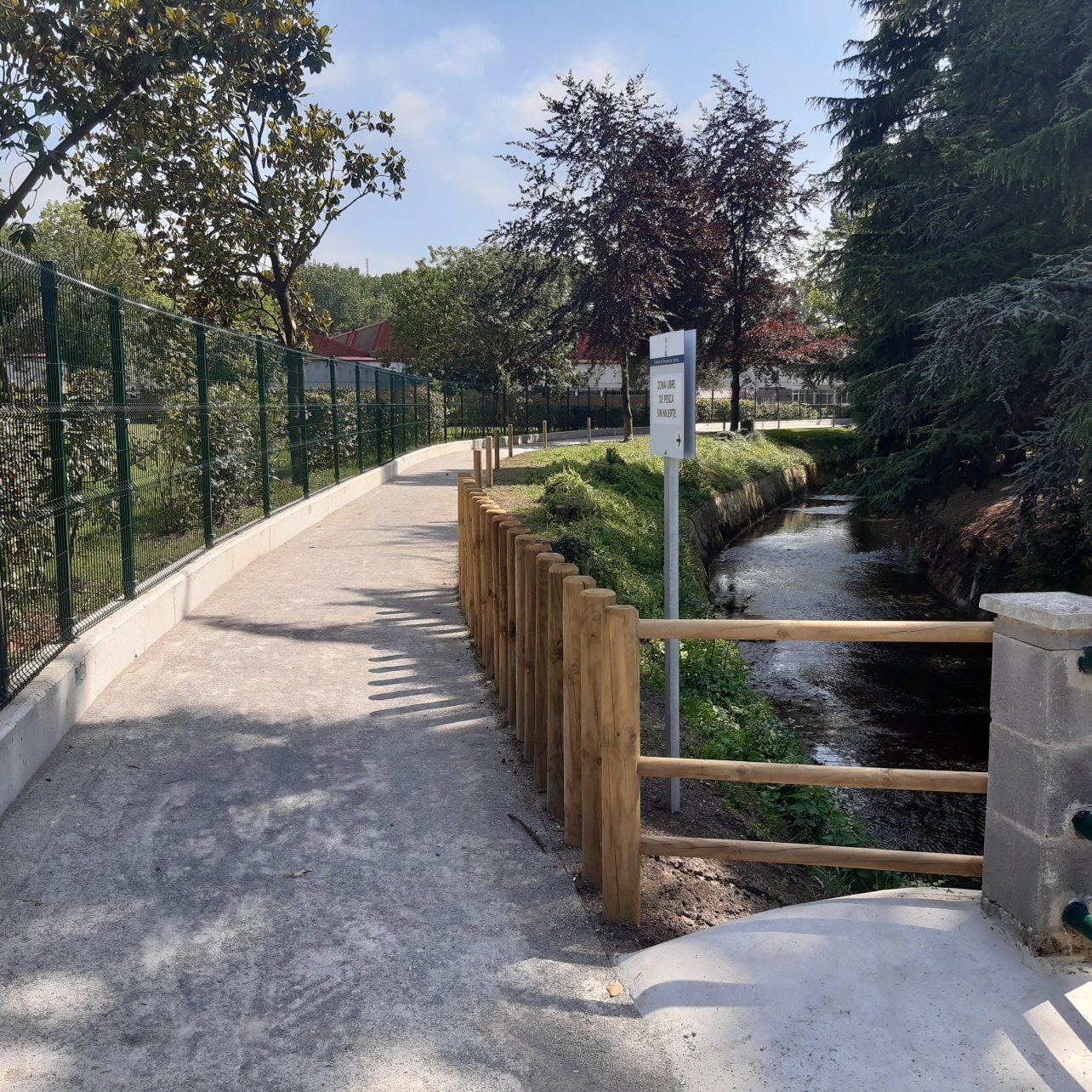 La actuación se ha complementado con la señalización de la senda con rollizos de madera de un metro de altura, que servirán de referencia visual, la recolocación del seto existente junto al nuevo cerramiento, para favorecer la privacidad de los usuarios de la piscina municipal, y el acondicionamiento ambiental de la zona de servidumbre del río en todo el tramo de la actuación.