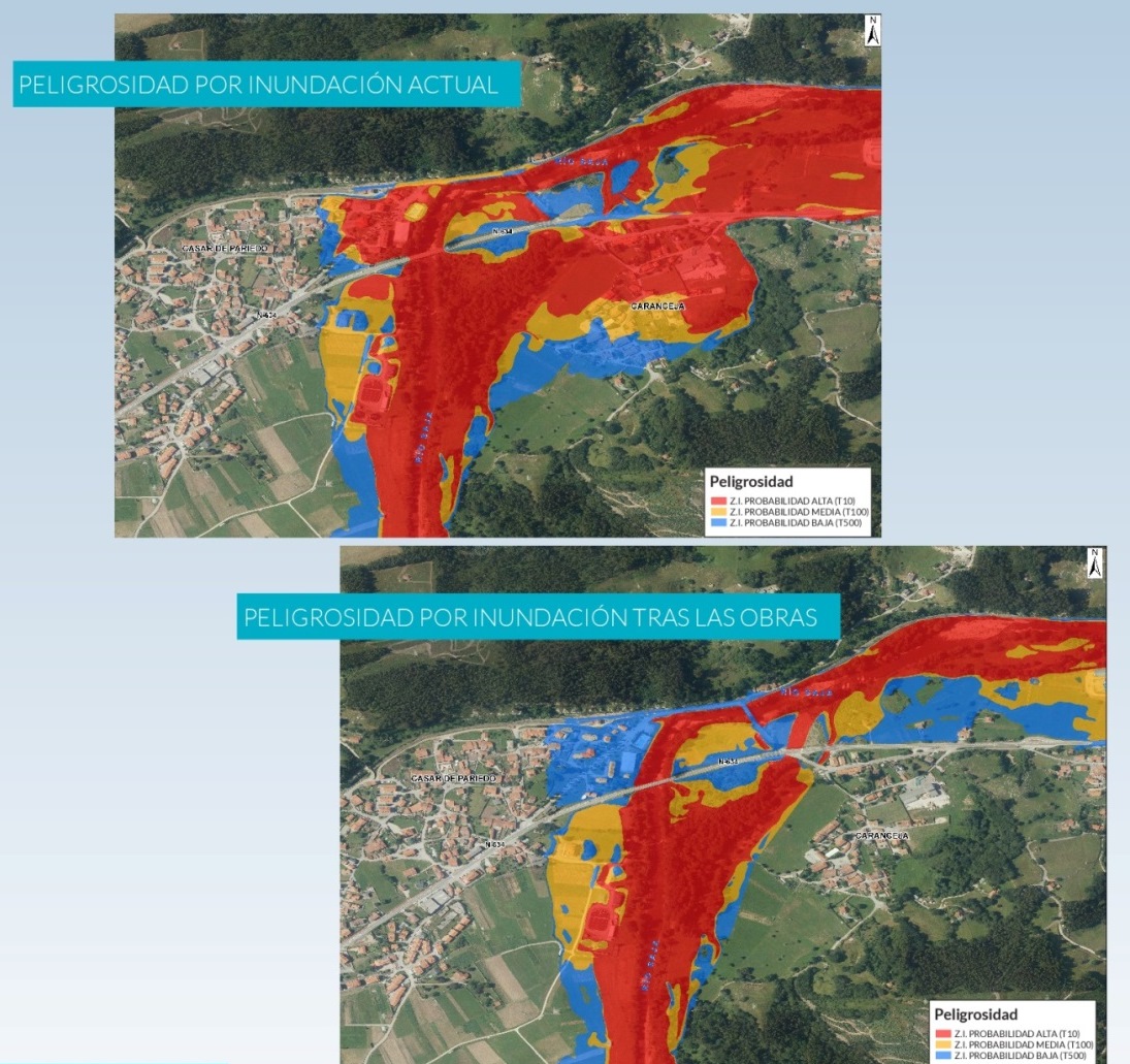 Estas actuaciones se complementarán, además, con elementos de defensa contra las avenidas de las poblaciones de Casar de Periedo y Caranceja, al ubicarse el tramo en cuestión en una de las áreas identificadas como de peligrosidad y riesgo extremo frente a inundaciones dentro de la Demarcación, por la posibilidad de resultar afectado un número elevado de población y provocar numerosos daños económicos.