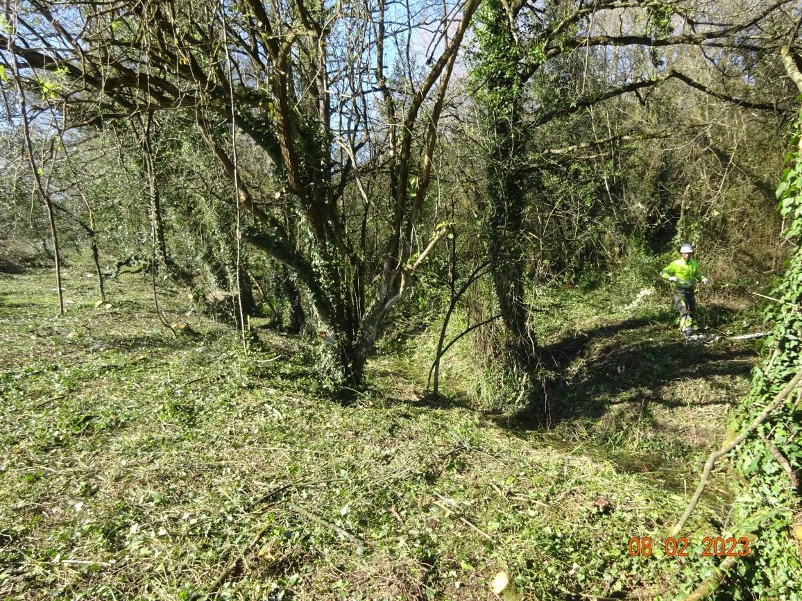 El trabajo consiste en el tratamiento de la vegetación que cubre ambas márgenes, la poda del arbolado existente, el apeo de aquellos árboles secos o enfermos y la retirada de restos vegetales acumulados formando tapones que reducen puntualmente la sección de desagüe del cauce.
