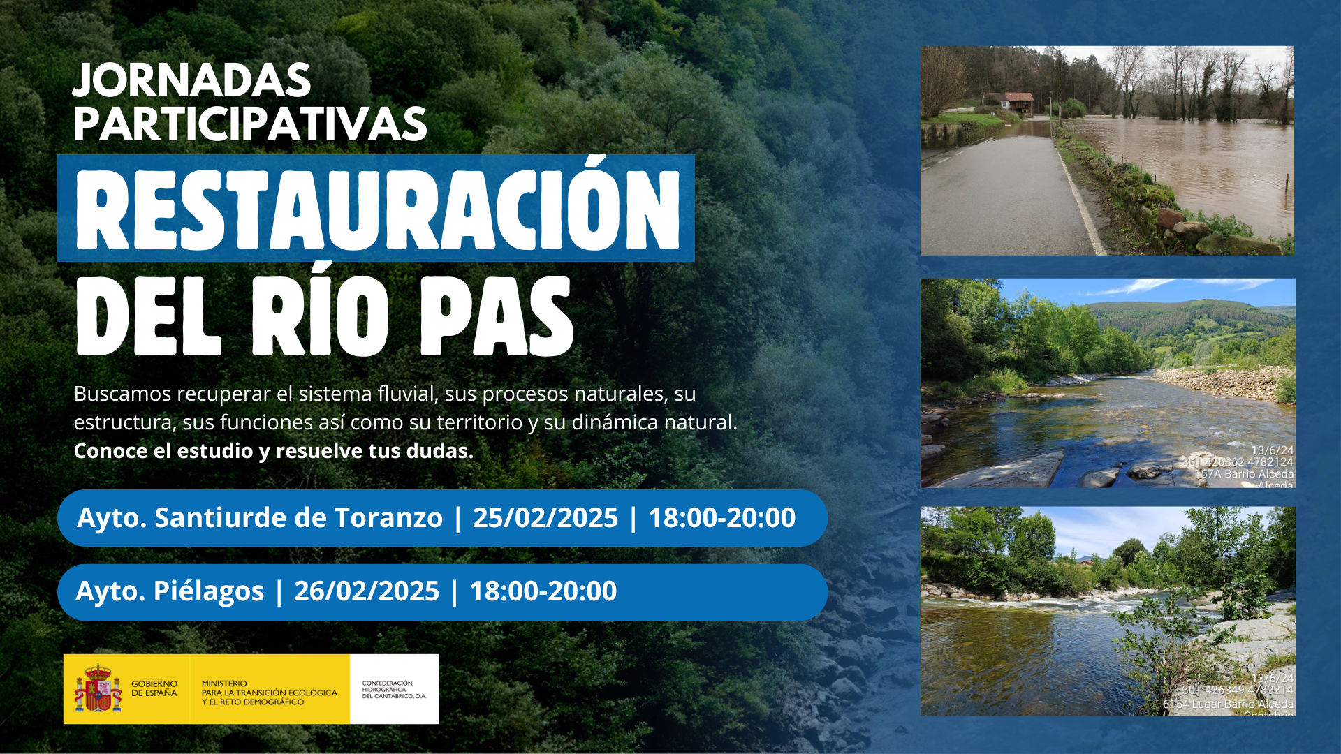 La primera jornada se celebrará en el Ayuntamiento de Santiurde de Toranzo el día 25 de febrero de 18:00 a 20:00 horas, y estará centrada en el tramo alto del río Pas. La segunda sesión se celebrará en el salón de plenos del Ayuntamiento de Piélagos el miércoles 26 de febrero, en el mismo horario, y en esta ocasión se debatirá sobre el tramo bajo del río.