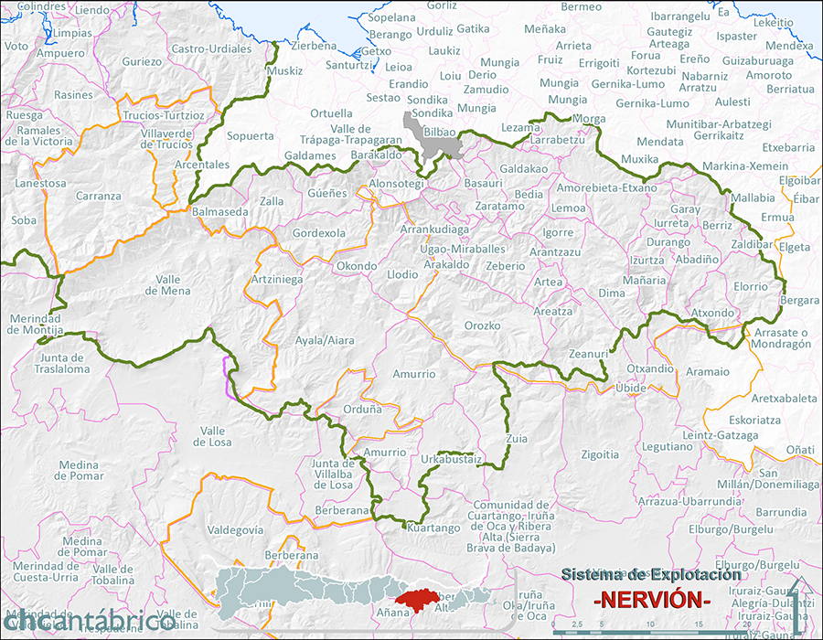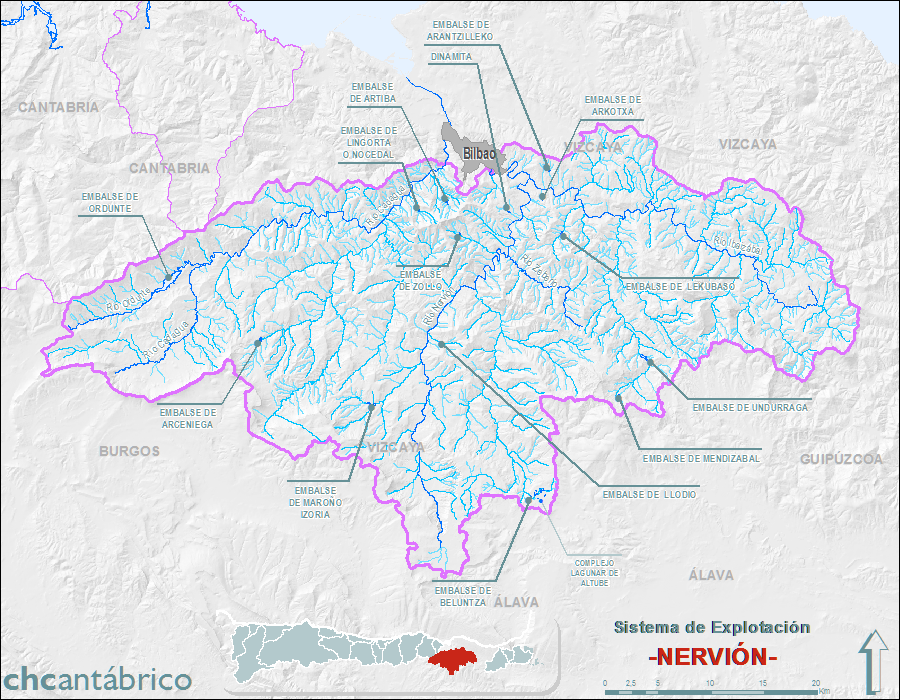 El Sistema de explotación del Nervión ocupa una superficie de 1.592,645 kilómetros cuadrados, encerrados dentro de un perímetro de 270 kilómetros, siendo el tercero en tamaño entre los 20 sistemas de la Confederación Hidrográfica del Cantábrico. Limita al norte con la provincia de Araba/Álava y al sur con las provincias de Bizkaia y Burgos. Su superficie se divide entre dos comunidades autónomas, Castilla-León y País Vasco, y esta última entre dos provincias, Bizkaia al norte y Araba/Álava al sur. Este terreno está compartido por 55 municipios, 42 de ellos vizcainos, 9 alaveses y los 3 restantes burgaleses.