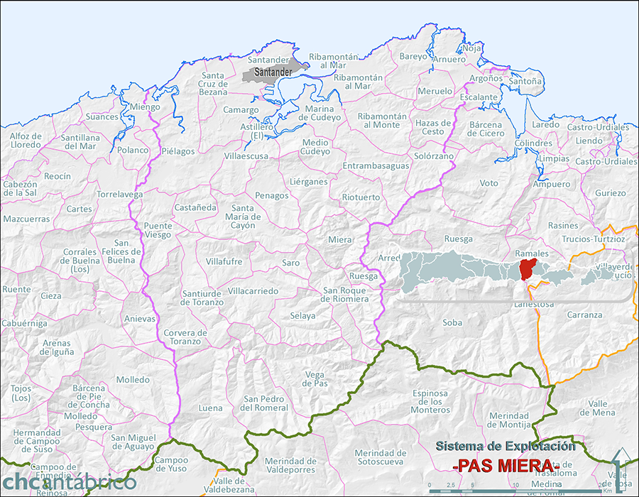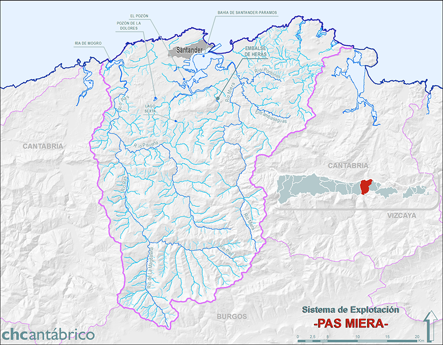 Este sistema se encuentra dividido en dos cuencas principales, las de los ríos Pas y Miera, junto a otras de pequeño recorrido muy restringidas a la costa a la que desaguan directamente. El Pas va desde las montañas en dirección al norte para terminar en la ría de Mogro, tras recoger las aguas del Pisueña, mientras que el Miera lo hace a través de la Bahía de Santander. En los noventa kilómetros de costa nos encontramos hasta con cinco rías más donde conviven las aguas de mar con las fluviales. En total los cursos recorren 1200 kilómetros para drenar el área.